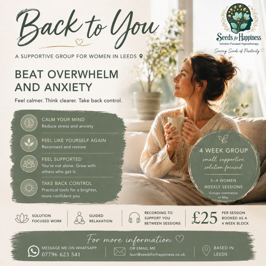 At Seeds for Happiness in Leeds, I offer Solution Focused Hypnotherapy to help calm the nervous system, reduce anxiety and support you in feeling more in control. Together, we focus on what you would like to be different, building small, manageable steps forward, making change feel steady and achievable.